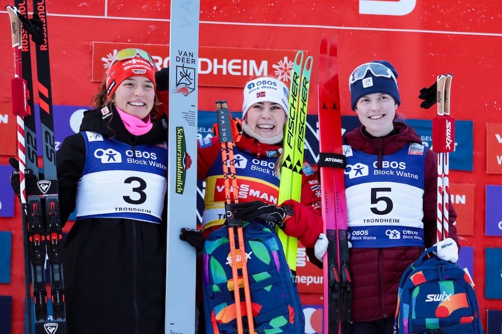 Brabec jumped a solid 94 meters on the HS102, with her points putting her in 5th place to start the 5km race, 1:12 back from the leader, Norway’s Ingrid Laate. She quickly skied up into a pack of 4 who caught and passed Laate. Brabec and Germany’s Nathalie Armbruster pulled away from that pack and were joined by Norway’s Ida Marie Hagen. The three top women skied together for most of the second lap, and Brabec held her position in third place, stepping upon the podium for the first time in her World Cup career. The social media posts exploded from US fans following @nordiccombinedusa and the US team celebrated alongside their training partners on the Norwegian team.